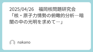 イベントの案内2025/04/26 福岡核問題研究会 「核・原子力情勢の俯瞰的分析―暗闇の中の光明を求めて―」の案内 日 時:2025年4月26日(土)10:00〜12:00様 式:オンライン開催話 題:「核・原子力情勢の俯瞰的分析―暗闇の中の光明を求めて―」報告者:岡本良治氏 2025.04.26 2025.12.07イベントの案内
