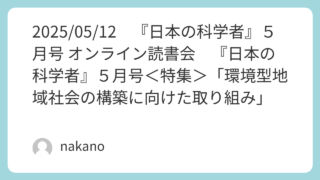イベントの案内2025/05/12 『日本の科学者』5月号 オンライン読書会 『日本の科学者』5月号<特集>「環境型地域社会の構築に向けた取り組み」 日 時:2025年5月12日(月)14:00〜16:30内 容:『日本の科学者』5月号<特集>「環境型地域社会の構築に向けた取り組み」 2025.05.12 2025.12.06イベントの案内