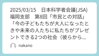 イベントの案内2025/03/15 日本科学者会議(JSA)福岡支部 第8回「市民との対話」「今の子どもたちが大人になったときや未来の人たちに私たちがプレゼントできる2つの社会(彼らから私たちが断罪されるような社会と称賛されるような社会)とそこへ至る道」 講師 伊藤久徳氏(九州大学名誉教授,元福岡市科学館館長・気象学)今の子どもたちが大人になったときの生活はどうなっているのでしょうか?気候危機(気候変化がもたらす危機)は生活と周りの環境をまったく別のものにしてしまう可能性があります。つまり気候危機とは単に気候だけの問題ではなく,自然環境や社会環境,そして生活などあらゆるものに危機的な問題をもたらしているものなのです。なぜ気候危機に陥っているのでしょう。今後どうなると予測されているのでしょう。まずこのまま放っておけば,社会に引き起こされる災厄は今とは比べものにならないレベルに達します。今の子どもたちや未来の人たち(彼ら)から我々が断罪されるのは確... 2025.02.18 2025.12.07イベントの案内