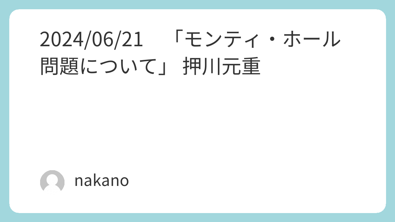 5月12日に開催された支部定期大会の活動方針の中に、「支部ニュースに会員の投稿記事も掲載していく」ことが示され、「エッセイと討論のための広場」というコラムが支部ニュースに連載されることになった。福岡支部ニュースNo.286(6月21日発行)に、そのコラムNo.1として、会員の押川元重氏の「モンティ・ホール問題について」が掲載された。そして、この記事を話題として第4回福岡支部談話会(オンライン)が開催された。この「モンティ・ホール問題について」についての説明は、押川氏による支部ニュースの記事(支部ホームページにも掲載)に詳しく書かれているので、そちらを参照していただきたい。以下、簡単に「問題」を紹介する。アメリカのテレビのクイズ番組で番組司会者が、番組参加者の1人に「3つの箱の1つに車が入っているので、1つ選んでください。」という。指名された参加者が1つの箱を選んだあとで、司会者は、選ばれなかった2つの箱の1つの箱を開けて、中に車が入っていないことを示し、参加者に「選んだ箱と、まだ開けていない箱を取り換えてもよいがどうするか?」と尋ねるが、参加者は交換を望まなかった。参加者の選んだ箱を開けると、車は入っていなかった。司会者は「実は箱を交換した方が、車が入っている確率が交換しない場合の2倍であったのです。」と言った。この最後の司会者の言葉が間違っているのではと、高名な学者を含めて議論となった。