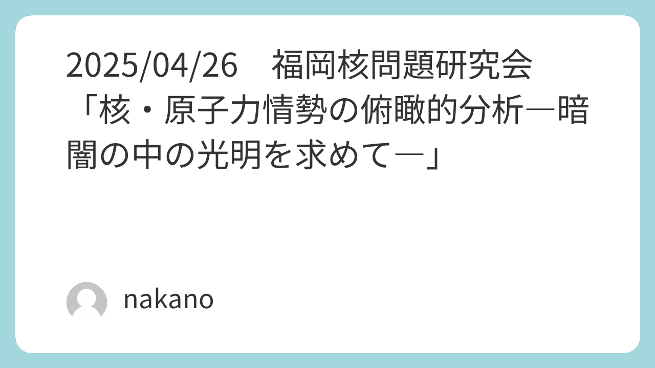 2025/04/26 福岡核問題研究会 「核・原子力情勢の俯瞰的分析―暗闇の中の光明を求めて―」の案内 イベントの案内 2025.04.262025.12.07日 時:2025年4月26日(土)10:00〜12:00様 式:オンライン開催話 題:「核・原子力情勢の俯瞰的分析―暗闇の中の光明を求めて―」報告者:岡本良治氏
