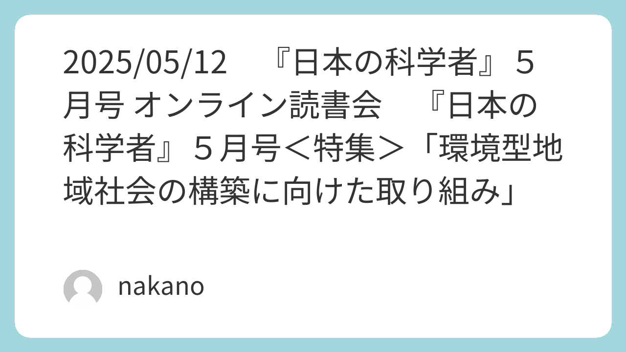 2025/05/12 『日本の科学者』5月号 オンライン読書会 『日本の科学者』5月号<特集>「環境型地域社会の構築に向けた取り組み」 イベントの案内 2025.05.122025.12.06日 時:2025年5月12日(月)14:00〜16:30内 容:『日本の科学者』5月号<特集>「環境型地域社会の構築に向けた取り組み」