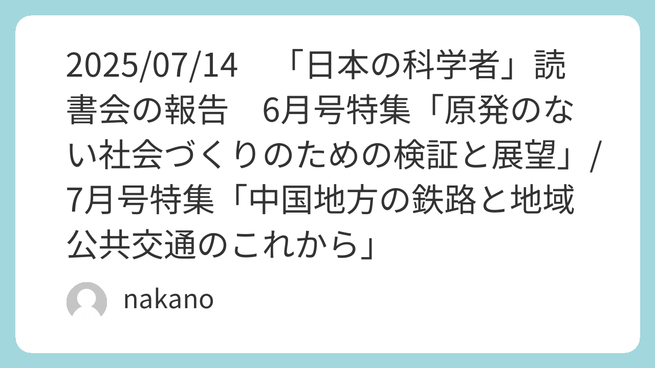 2025/07/14 「日本の科学者」読書会の報告 6月号特集「原発のない社会づくりのための検証と展望」/7月号特集「中国地方の鉄路と地域公共交通のこれから」